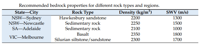 - If the information of the bedrock shearwave velocity and density is not available, a default value from the following table may be used.